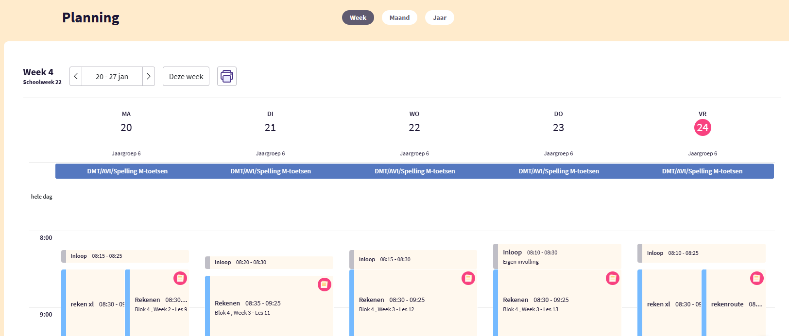 De planning die volgt uit je basisrooster kun je altijd en op elke manier aanpassen. Dat kan onder andere in het menu Planning. Daarin zie je per week welke lessen gepland zijn.